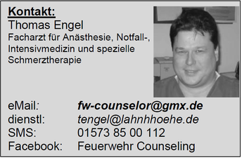 Nach Absolvierung der Grundkurse der SbE (Stressbewältigung nach belastenden Ereignissen) e.V., bin ich im Defusing und Debriefing der Einsatznachsorge ausgebildet und entwickele nun das primär auf Prävention, aber auch individueller (Nach-) Betreuung beruhende COUNSELING-Konzept.